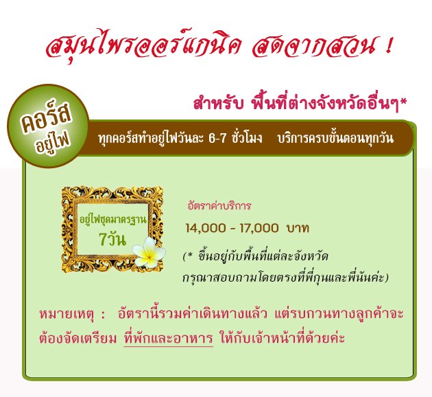 - เรือนไทยคอร์สอยู่ไฟ ชุดมาตรฐาน 7 วัน (วันละ 6-7 ชั่วโมง)