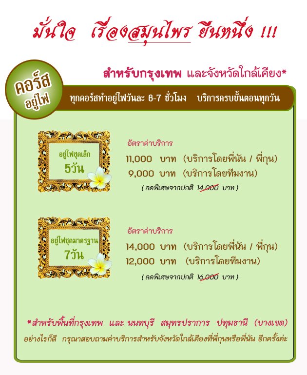 (ราคานี้รวมค่าบริการอยู่ไฟ  ค่าสมุนไพรทั้งหมดที่ใช้อยู่ไฟซึ่งเราใส่เต็มที่  (สมุนไพรสด, สมุนไพรขัดผิว, สมุนไพรอบตัว)  ค่าอุปกรณ์ต่างๆรวมอุปกรณ์ไฟชุดสำรับหลวง และค่าเดินทางเรียบร้อยแล้ว)